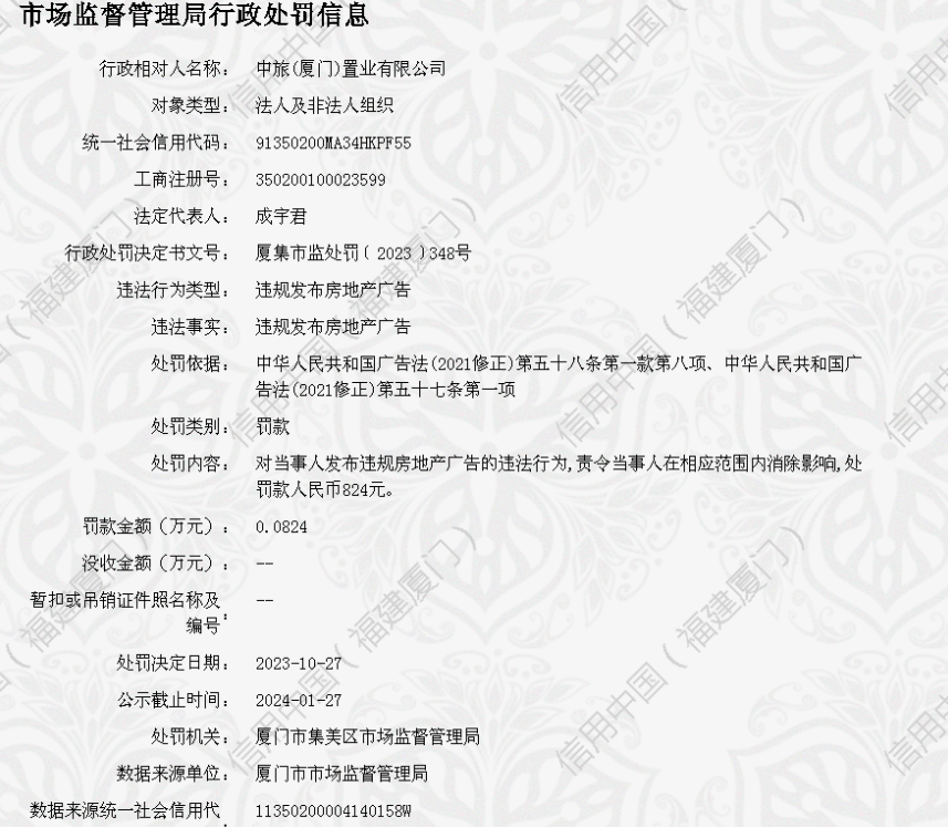 违规发布房地产广告 中旅(厦门)置业有限公司被罚