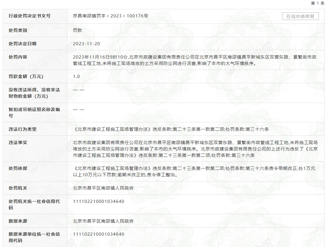 信用中国披露,北京市政建设集团有限责任公司还曾因未将施工现场堆放的土方采用防尘网进行苫盖,影响了大气环境秩序被北京市昌平区南邵镇人民政府罚款1万元。