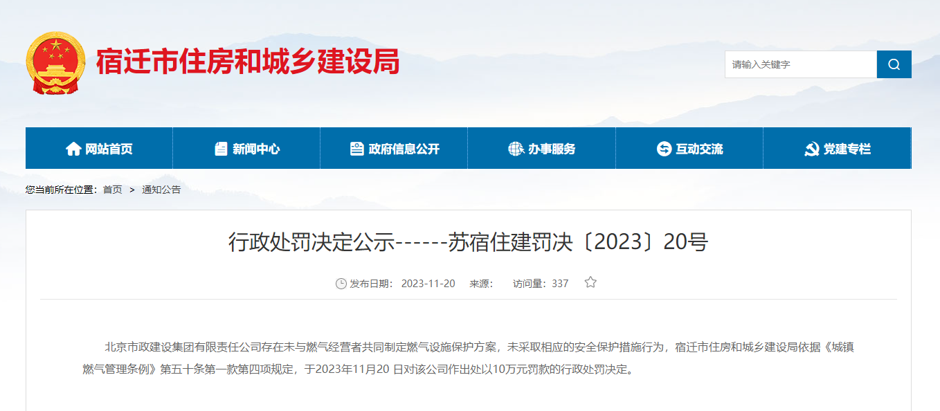 违法事实:北京市政建设集团有限责任公司存在未与燃气经营者共同制定燃气设施保护方案,未采取相应的安全保护措施行为,宿迁市住房和城乡建设局依据《城镇燃气管理条例》第五十条第一款第四项规定,于2023年11月20日对该公司作出处以10万元罚款的行政处罚决定。