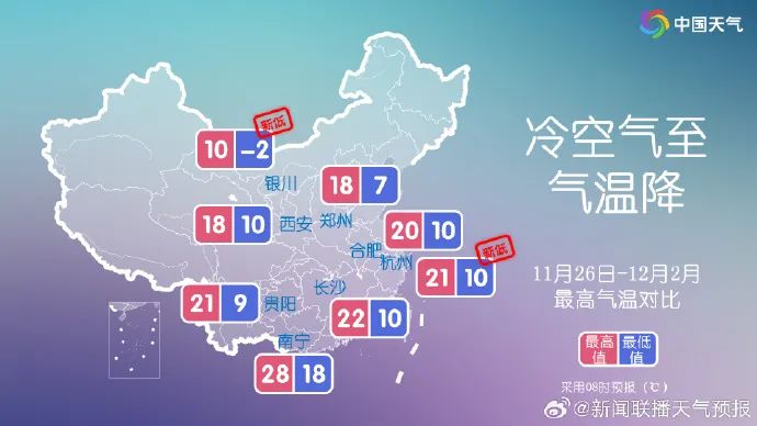 今天起,新一轮较强冷空气已经开始影响内蒙古,明后天(27~28日)影响长江中下游及其以北地区,紧接着29-30日补充冷空气将继续影响中东部大部。