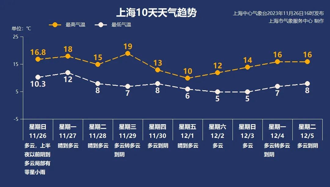 今天(11月26日)7时,2023年上海马拉松比赛在蓝天白云中开跑,全天气温在10.3℃~16.8℃之间(以中心城区徐家汇站为例),风力不大。中午开始云系逐渐增多,天空阴沉,奉贤还飘了短时小雨,雨势微弱。预计今天夜间阴到多云,上半夜以前局部地区有零星小雨。