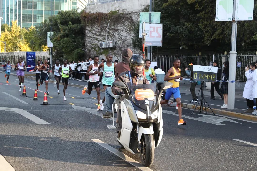 早上7时22分,开道车迎着朝阳,缓缓驶入常熟路淮海中路,第一梯队选手已经进入徐汇赛段。他们迈着矫健有力的步伐,不断摆动双臂,保持着均匀节奏的呼吸,自信地迎接着接下来的比赛。