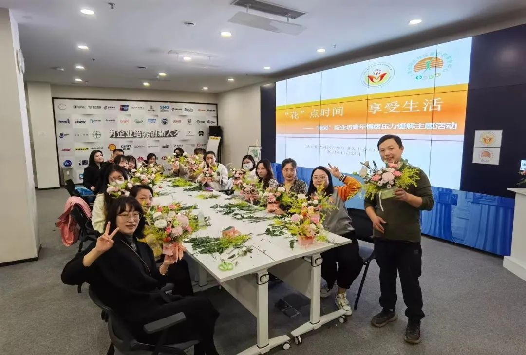 为丰富新业坊·源创入驻企业员工的精神文化生活,为大家增加生活情趣,舒缓工作压力,近日,上海市阳光星辰少年司法社会服务中心携手临港资管公司,在新业坊LAB路演厅开展了“境彩·新业坊”企业青年午间一小时系列活动。本次活动由上海市阳光社区青少年事务中心(简称:市阳光中心)宝山工作站高境镇社工点承办,得到了高境镇团委、平安办以及新业坊创新创业示范园大力支持。包括妃鱼在内的多家企业员工共计20余人沉浸在精彩的花艺分享课中,通过花香、花艺感受“境彩”世界里的惬意生活。