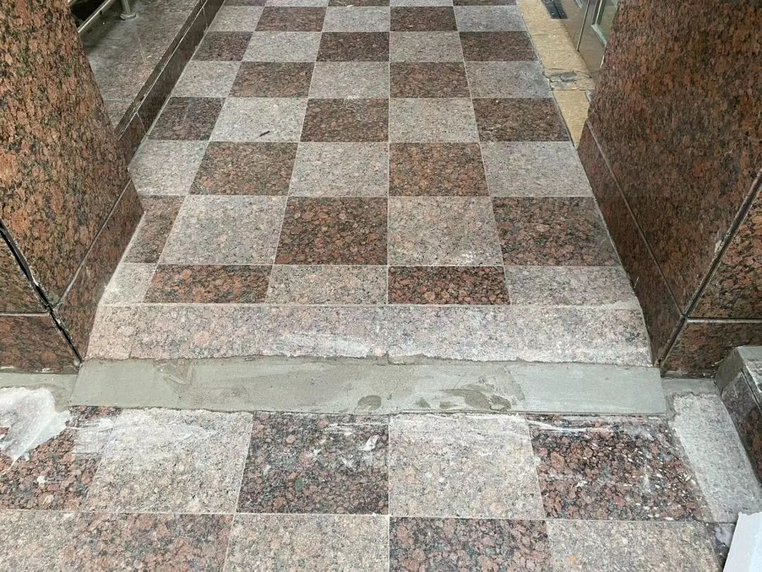 社区工作者立即联系物业,协调维修人员对这些区域抓紧开展修复工作。修复计划被迅速排上日程,第二天下午,维修人员就行动起来,先立起警示标识,提示过往居民注意脚下,再用水泥将瓷砖裂缝补好,最后在落差部位抹出一个“小斜坡”,解决高低差带来的安全问题。