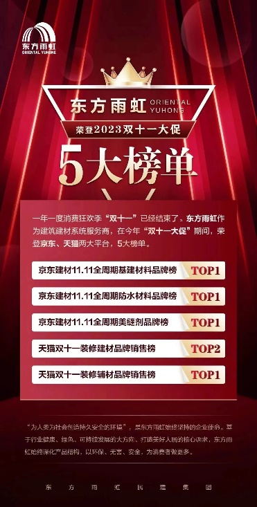 以更高效的研发体系,更全面的产品矩阵,更快捷的响应速度,更安心的专业服务,为舒适安居生活赋能添彩。在聚焦聚力、深耕细作的实践探索中,企业不仅赢得了可观的关注度和信任度,加速了品牌势能、市场口碑以及圈层认知的提升,更实现了强劲的业绩增长和亮眼的经营表现。在刚刚过去的“双十一”电商大促中,东方雨虹荣登京东、天猫两大平台五大榜单,充分体现出市场及消费者对企业“以人为本,多品类创新场景服务”的发展理念的认可与肯定。