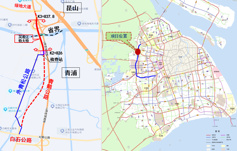 同时通车的还有外青松公路(白石公路-江苏省界)新改建工程。该工程基本呈南北走向,南起青浦区白石公路,北至江苏省界,与昆山市绿地大道相连接。道路等级为二级公路,设计速度60公里/时,双向6车道规模。通车后有效提升青浦区与昆山市之间的通行时效,进一步完善区域路网结构,并分担该区域高速公路G1503的交通压力,将对方便两地居民出行、联系,加快周边区域经济建设起到重要作用。