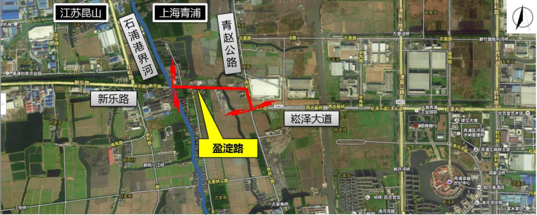 盈淀路项目位于青浦区西部,是青浦区对接昆山市淀山湖镇的一条东西走向道路,向西与昆山市锦淀公路(新乐路)相接。盈淀路长约630米,同步改造的青赵公路(盈淀路-崧泽大道段)约260米,全长共约890米。通车后,盈淀路道路等级为一级公路,设计车速60公里/时,双向4快2慢,新建桥梁2座。