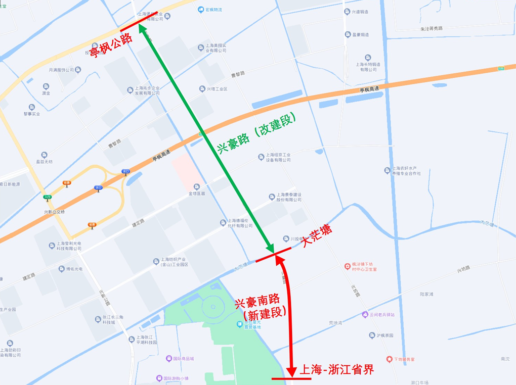 金山区兴豪路(亭枫公路-浙江省界)改扩建工程于2021年12月28日建成通车。该项目北起亭枫公路,南至沪浙省界,全长2.82公里,技术等级为二级公路,建设规模为双向6快2慢。