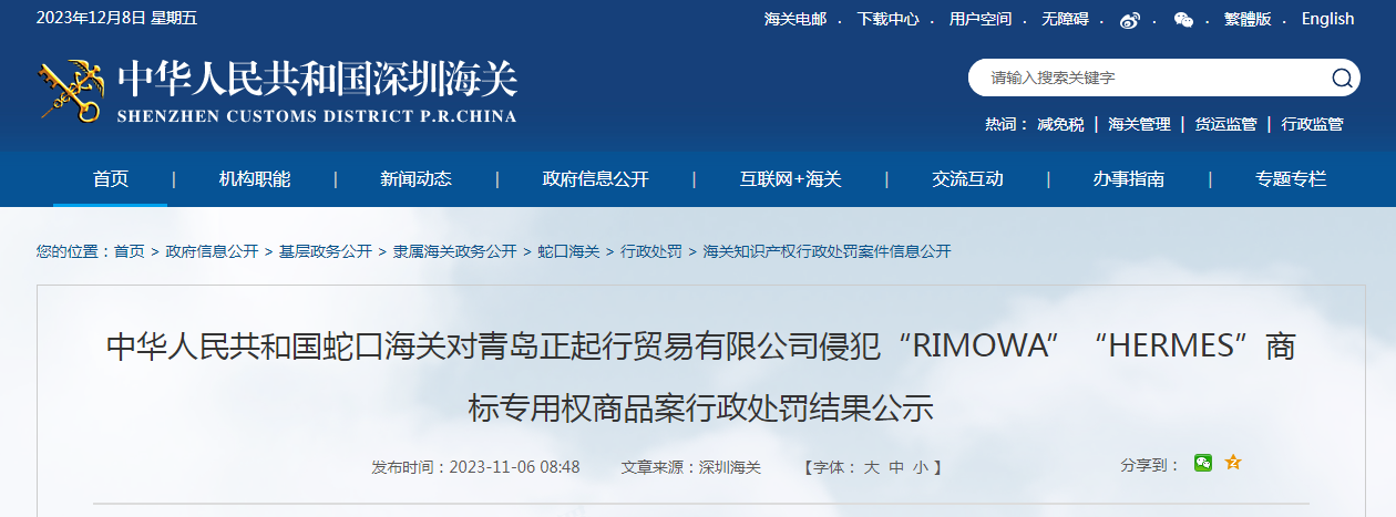中华人民共和国蛇口海关对青岛正起行贸易有限公司侵犯“RIMOWA”“HERMES”商标专用权商品案行政处罚结果公示.pdf