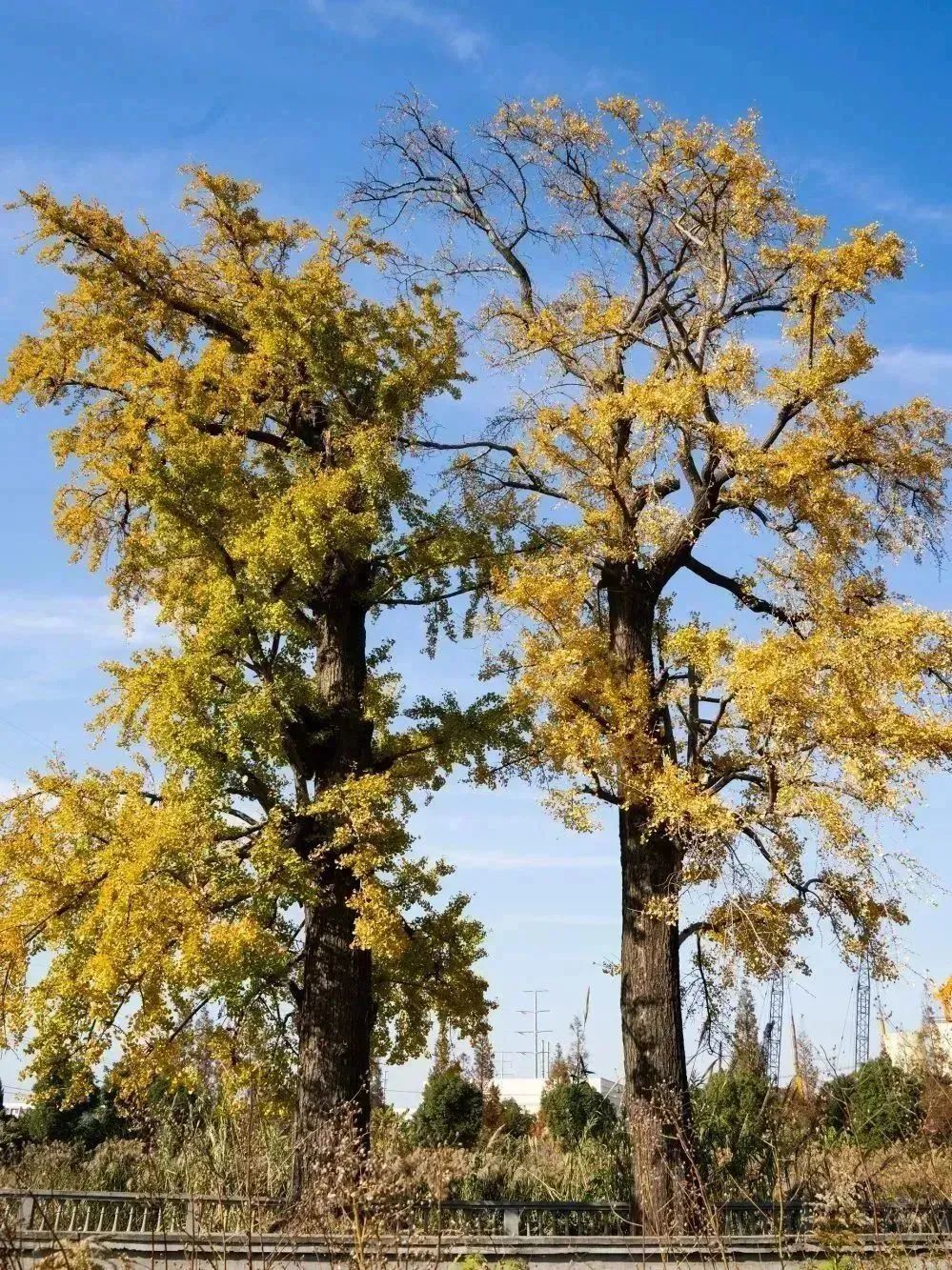 位于孔宅遗址的这两棵古银杏树编号为0082、0083,1986年确认树龄皆是450年,属于一级保护对象。两棵古树紧紧相邻,枝叶缠绕,似互相扶持。奇特的是,同样环境下的两棵树呈现出截然不同的样貌,一棵枝繁叶茂,在暖阳的照耀下金光闪烁,而另外一棵金黄“外衣”即将褪去,黄叶飘零,落入深秋。
