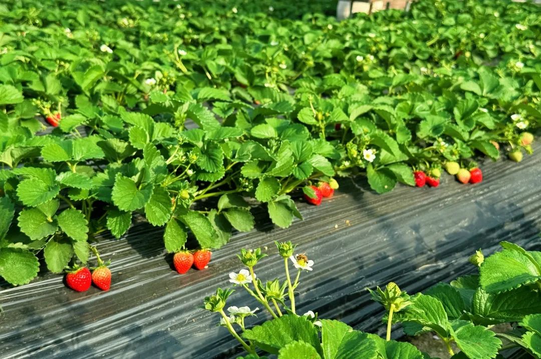 由于园区内草莓传粉都是依靠蜜蜂,因此在采摘草莓的时候难免会遇到采蜜的小蜜蜂,提醒小朋友切勿因为好奇去主动招惹它们,不然会被蜇伤的。