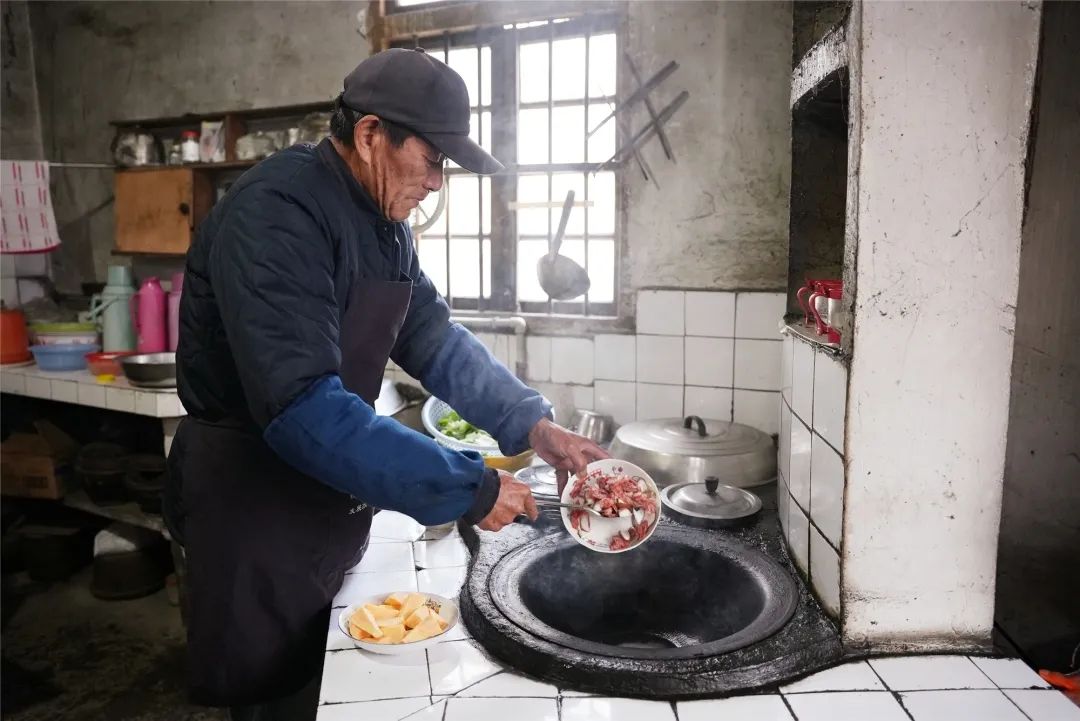 说着说着,菜饭出炉了,掀开锅盖,老灶上冒着热气,香味弥漫着整个厨房间,配上一碗番茄蛋汤,咀嚼着饭香,暖暖的下肚,王培忠和妻子黄秀兴,还有93岁的母亲围坐在一起吃着饭,絮絮回味过往种种。