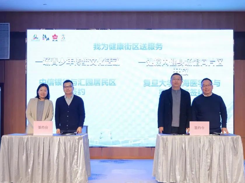 图片说明:左:一场青少年传统文化活动——中信银行与汇园居民区签约。右:一处校内健身场馆向片区开放——复旦大学上海医学院与振兴片区签约。