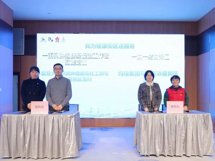 图片说明:左:一系列肿瘤康复促进工作者赋能培训——复旦大学附属肿瘤医院社工部与振兴居民区签约。右:一对一结对帮困——均瑶集团与张家浜居民区签约。