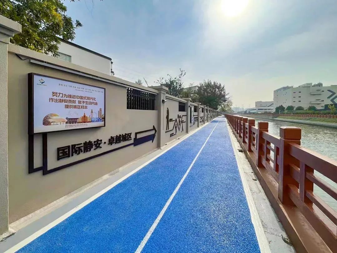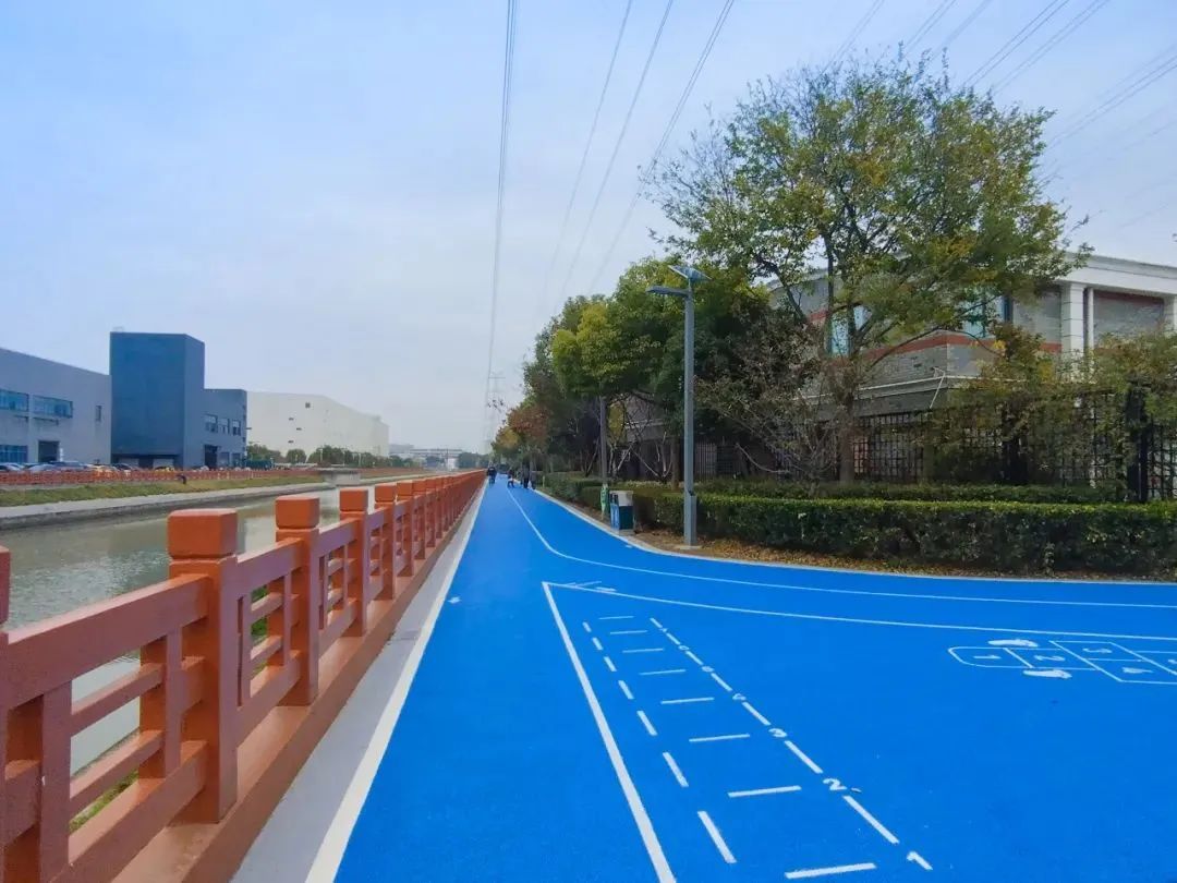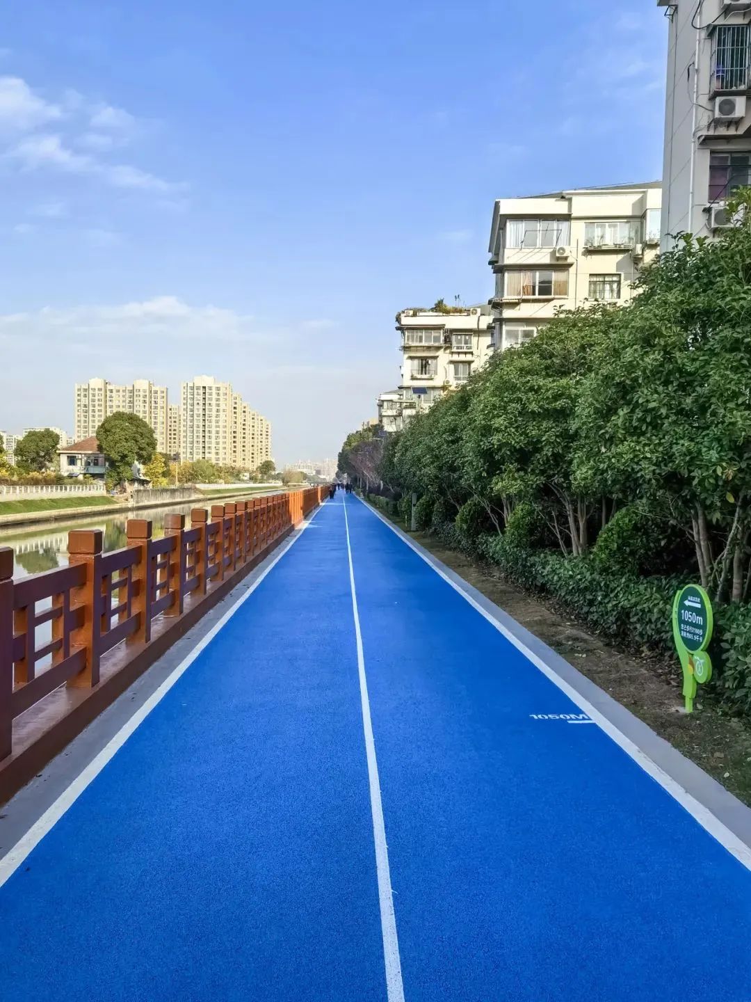 合理规划步道走向,注重提升舒适度。步道沿着东茭泾的水流走向而建设,让市民群众能在散步锻炼的同时,最大程度欣赏到水岸风光,亲近自然。步道采用环保涂料,蓝色的路面向前延伸,与天空融为一体,漫步于此,行人仿佛也走入了蔚蓝的天空中。
