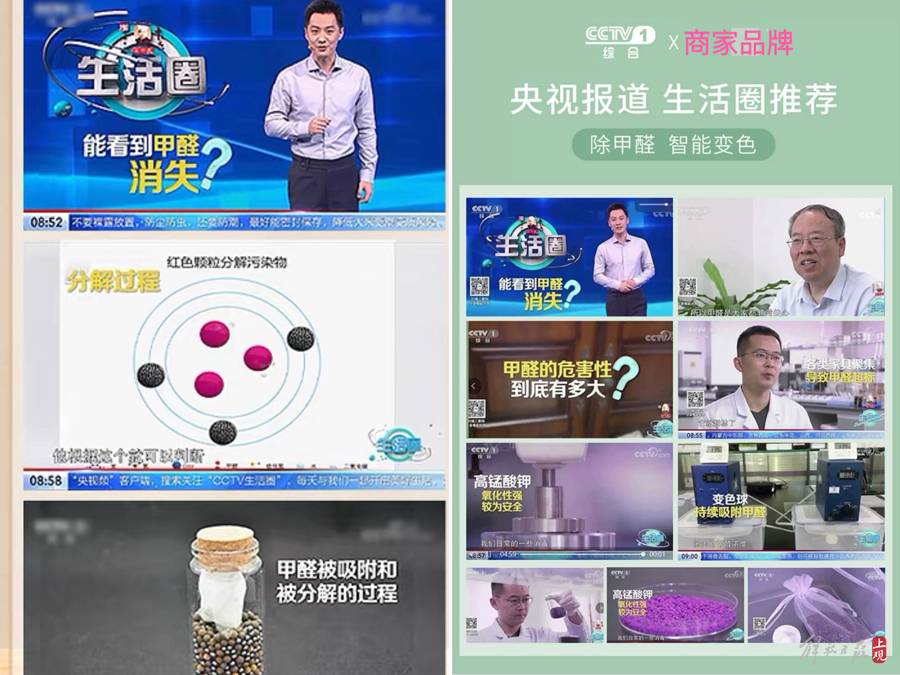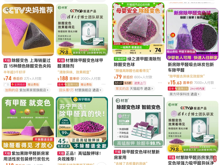 市民黎先生最近装修,想上网买些去除甲醛的产品,发现很多商家不约而同打出“央视推荐”“清华研发”的旗号。再看产品,都是紫色和黑色的两种小球。商家为了证明这些产品是“央视推荐”和“清华研发”,大多提供了电视节目截屏。截屏上确实有变色小球,并标注“甲醛被吸附和被分解的过程”。