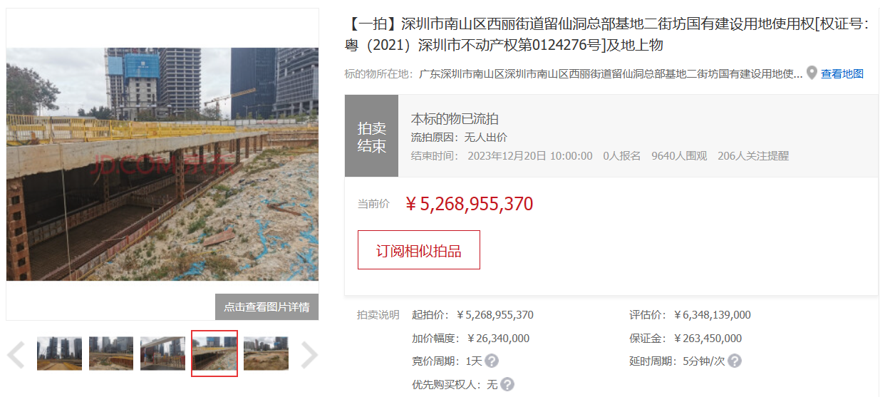 12月20日,京东法拍平台披露的信息显示,“深圳市南山区西丽街道留仙洞总部基地二街坊国有建设用地使用权[权证号:粤(2021)深圳市不动产权第0124276号]及地上物”因无人出价流拍,该标的物的起拍价约52.68亿元,评估价约63.48亿元。