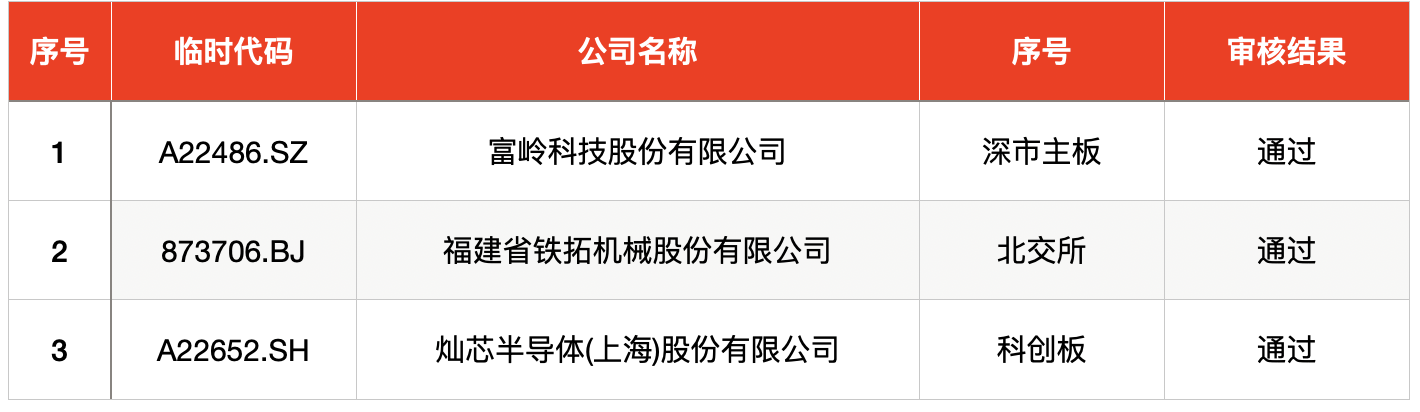 发审委审核方面,上周共有3家企业首发过会,富岭科技股份有限公司、福建省铁拓机械股份有限公司、灿芯半导体(上海)股份有限公司获得通过。