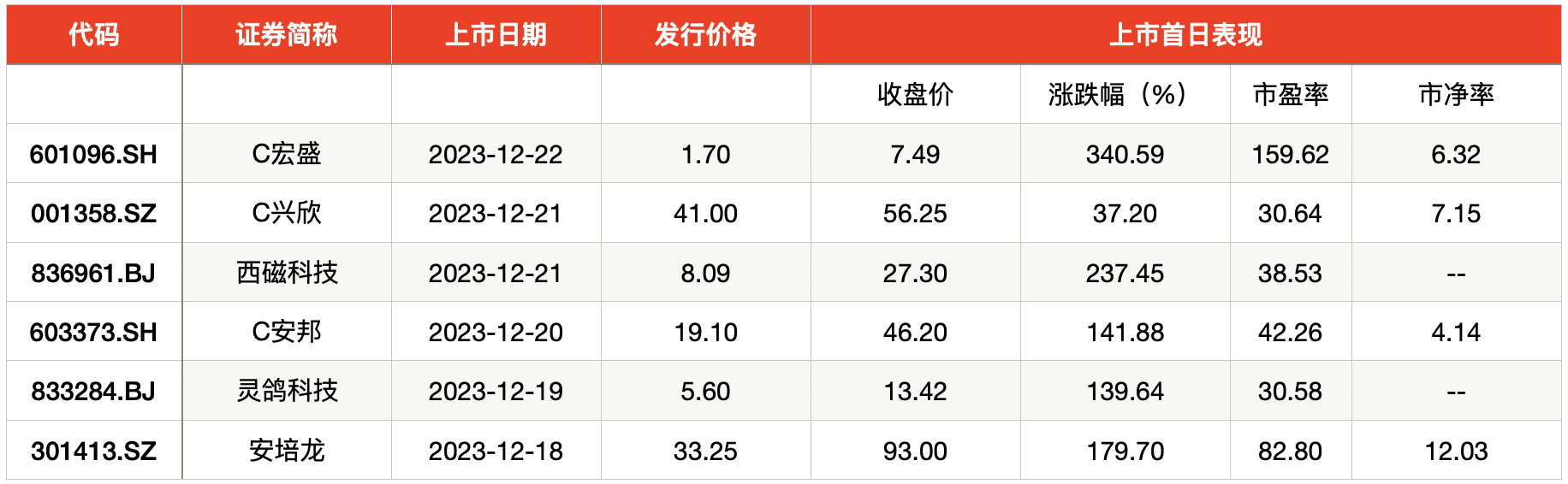 以首日收盘价计算,上周上市的6只新股中,共诞生5只翻倍股,其中,宏盛华源上市首日涨幅最高。12月22日,宏盛华源在沪市主板上市,发行价为1.70元,上市首日开盘后,一度冲高至9.90元,最终报收于7.49元,涨幅340.59%。西磁科技、安邦护卫、灵鸽科技、安培龙上市首日涨幅分别为237.45%、141.88%、139.64%、179.70%。其中,安培龙、安邦护卫单签收益过万,以收盘价计算,安培龙中一签,投资者盈利高达29875元,安邦护卫单签盈利则为13550元。
