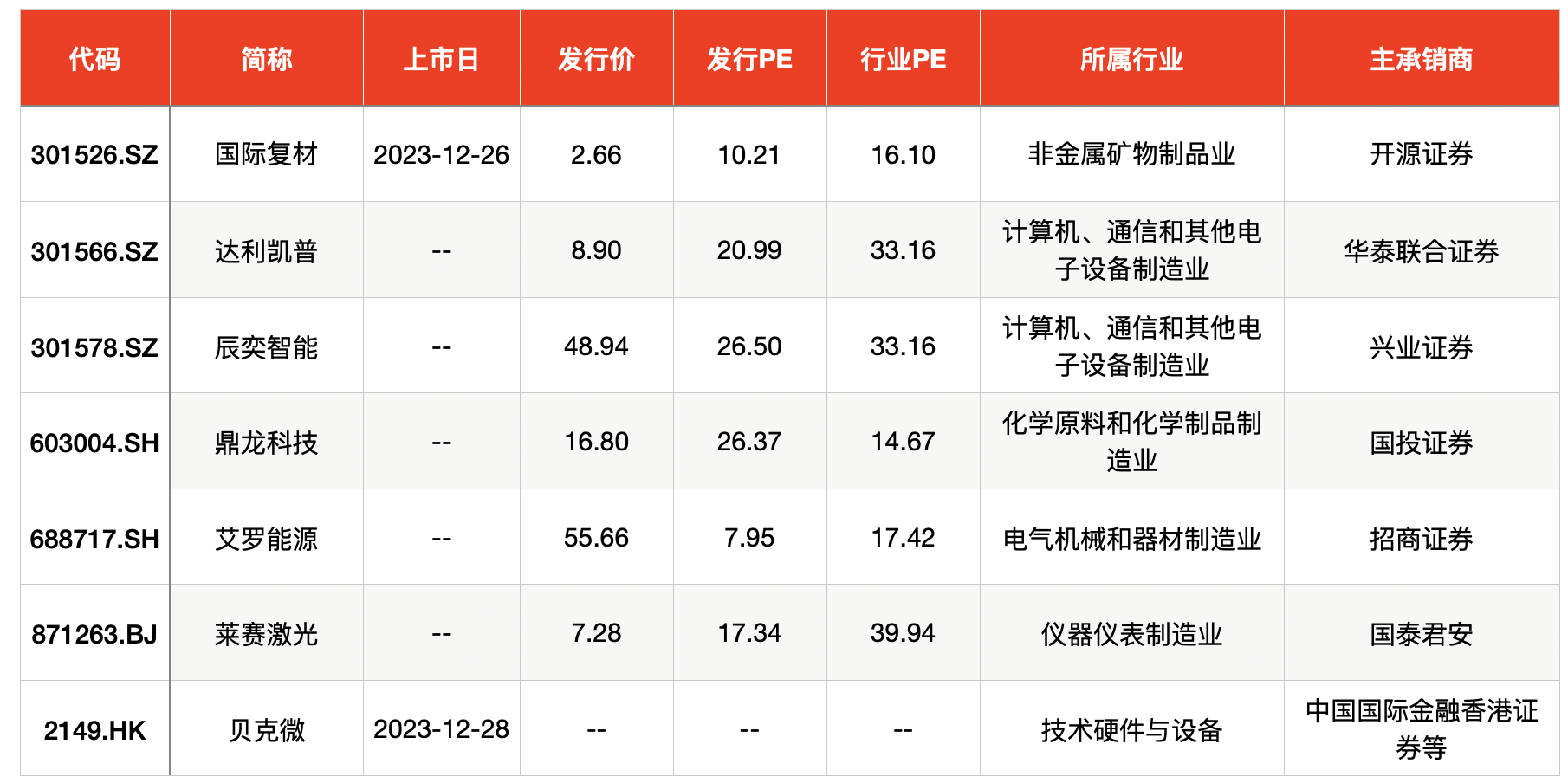 上周共有6只新股上市,为深圳安培龙科技股份有限公司(简称“安培龙”,301413.SZ)、无锡灵鸽机械科技股份有限公司(简称“灵鸽科技”,833284.BJ)、安邦护卫集团股份有限公司(简称“安邦护卫”,603373.SH)、宁波西磁科技发展股份有限公司(简称“西磁科技”,836961.BJ)、绍兴兴欣新材料股份有限公司(简称“兴欣新材”,001358.SZ)、宏盛华源铁塔集团股份有限公司(简称“宏盛华源”,601096.SH)。
