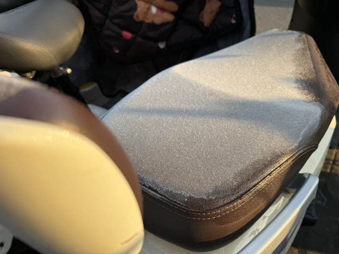 早上7点多,气温延续在0度附近,记者拍到在部分地铁站非机动车道上,停靠了一晚上的电瓶车坐垫上、扶手处均薄薄的覆盖了一层白色霜花。