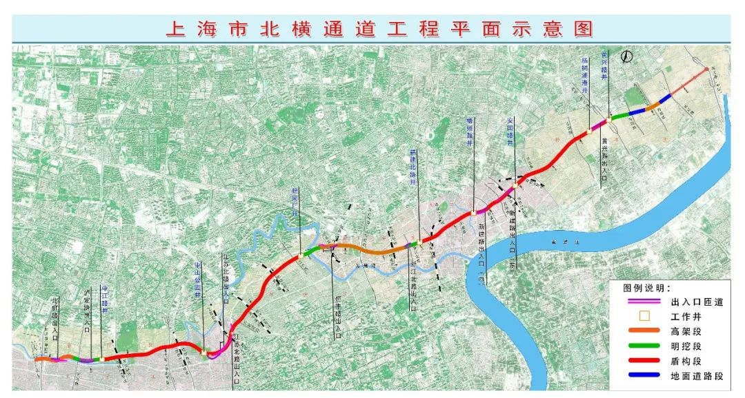 北横通道新建工程全长19.1公里,以文安路为界划分为东西两段,其中西段工程为北虹路立交至天目路立交文安路接地点,长约10.9公里;东段工程为文安路接地点至周家嘴路内江路,长约8.2公里。北横西段主线已于2021年6月18日下午通车。