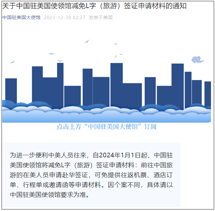 微信公众号“中国驻美国大使馆”12月30日消息,为进一步便利中美人员往来,自2024年1月1日起,中国驻美国使领馆将减免L字(旅游)签证申请材料:前往中国旅游的在美人员申请赴华签证,可免提供往返机票、酒店订单、行程单或邀请函等申请材料。因个案不同,具体请以中国驻美国使领馆要求为准。