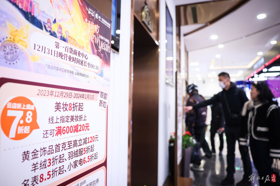 2023年12月31日,南京东路步行街上的商场“各显神通”,推出延迟营业和满减赠好礼等促销方式,助力跨年消费。