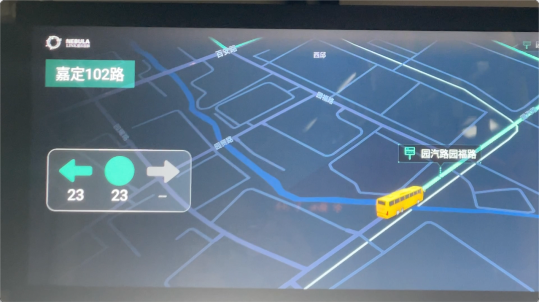 记者随机跟上一辆嘉定102路,可以看到该车从安亭汽车站驶出后,尾屏实时显示:“左转绿灯倒计时3秒、2秒、1秒”,变为黄灯、绿灯,几乎没有时延。而当车辆继续开出50米左右,尾屏突然停止显示,直到靠近下个路口又再次同步成功。