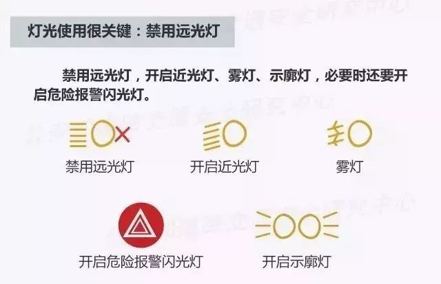雾天开车还要注意灯光的使用,记住一定要打开前后雾灯以及应急灯,如果没有雾灯的车辆要打开近光灯,千万不要打开远光灯,远光会被迷雾反射看不清道路的。