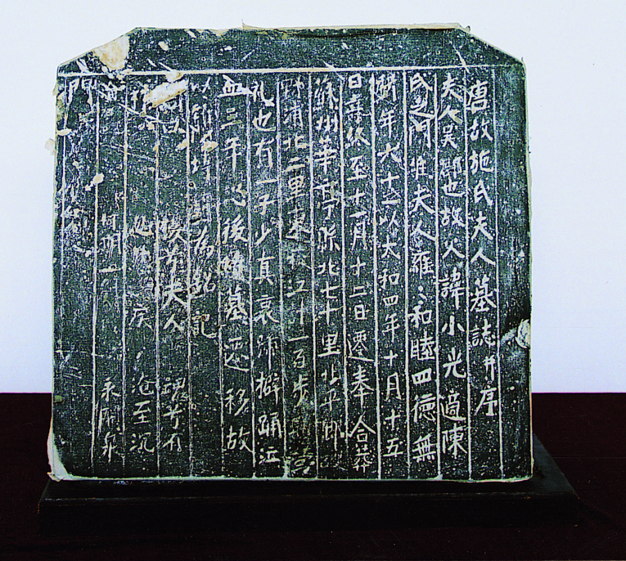 《唐故施氏夫人墓志》称:“夫人吴郡也,故父讳小光。适陈氏之门,维夫人雍雍和睦,四德无亏,年六十一,以大和四年十月十五日寿终,至十一月十二日迁奉合葬苏州华亭县北七十里北平乡□野浦北二里东崧江计一百步。斯营,礼也。有一子,少真。哀号擗踊,泣血三年。恐后坟墓迁移,故以镌砖,以为铭记。铭曰:□兮夫人,魂兮□□。忽□□戾,淹至沉□。何期一□,永闭泉门。”