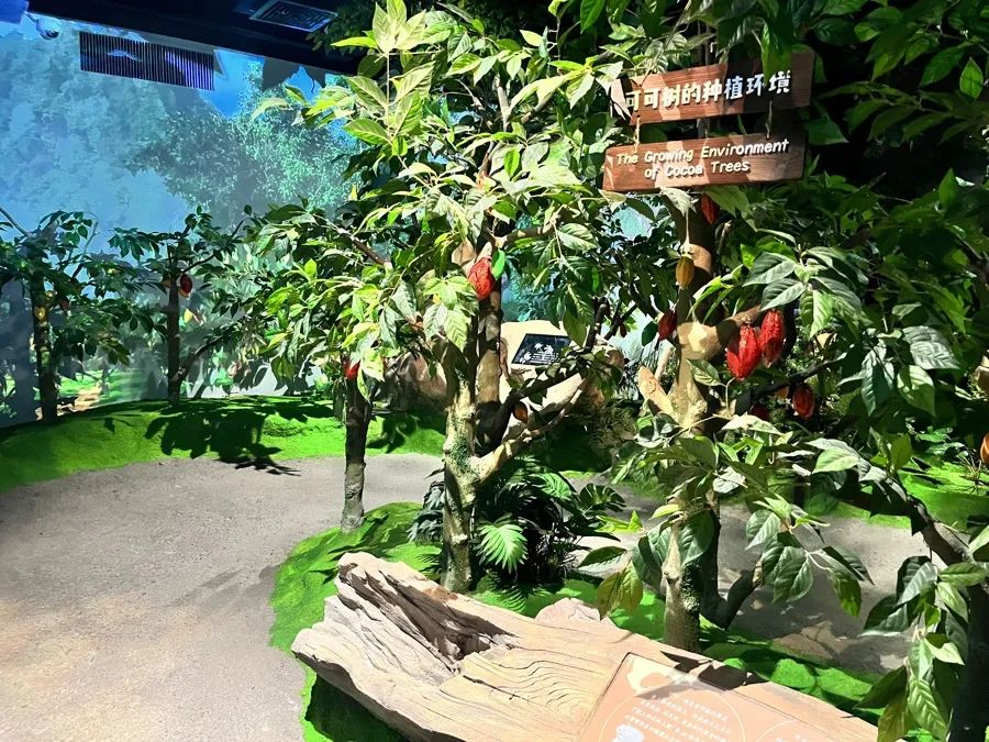 例如,可可树究竟长什么样?一般人可能只见过经过加工处理、成为产品形态的巧克力,但对于可可树、可可果的大小及种植环境并不了解。为了让观众有直观感受,馆内模拟了可可树的生长环境,制作了一比一还原、结满红彤彤可可果的可可树,还通过屏幕讲解了可可花的形态。