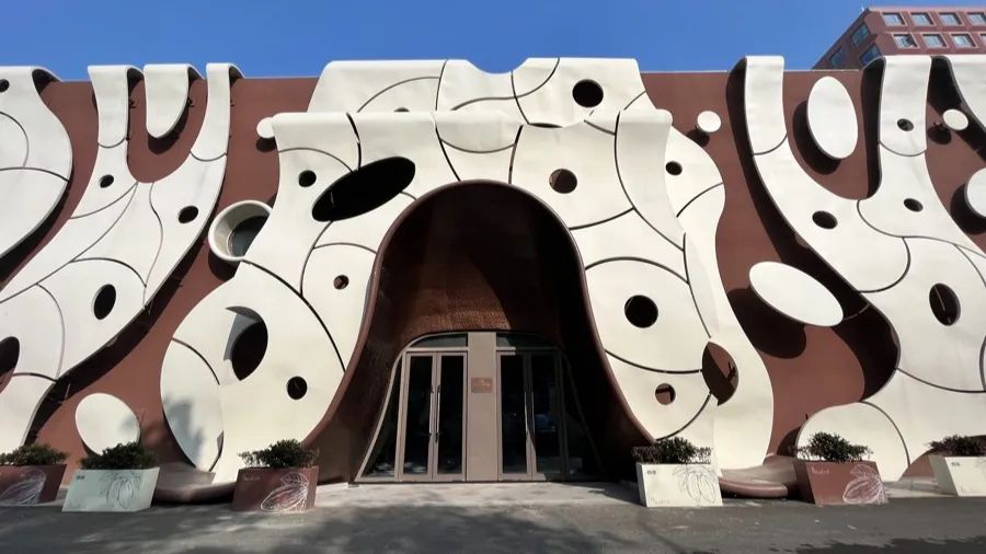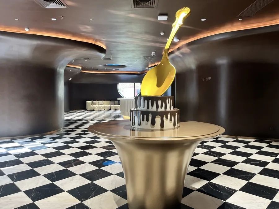 看一眼酷似牛奶巧克力的建筑外观,还没进门,人们可能就会不自觉流起口水。黑白格地砖、棕色墙面,摆在中央正在挖“巧克力蛋糕”的金色勺子雕塑,让人一走进来就能感受到独特氛围。
