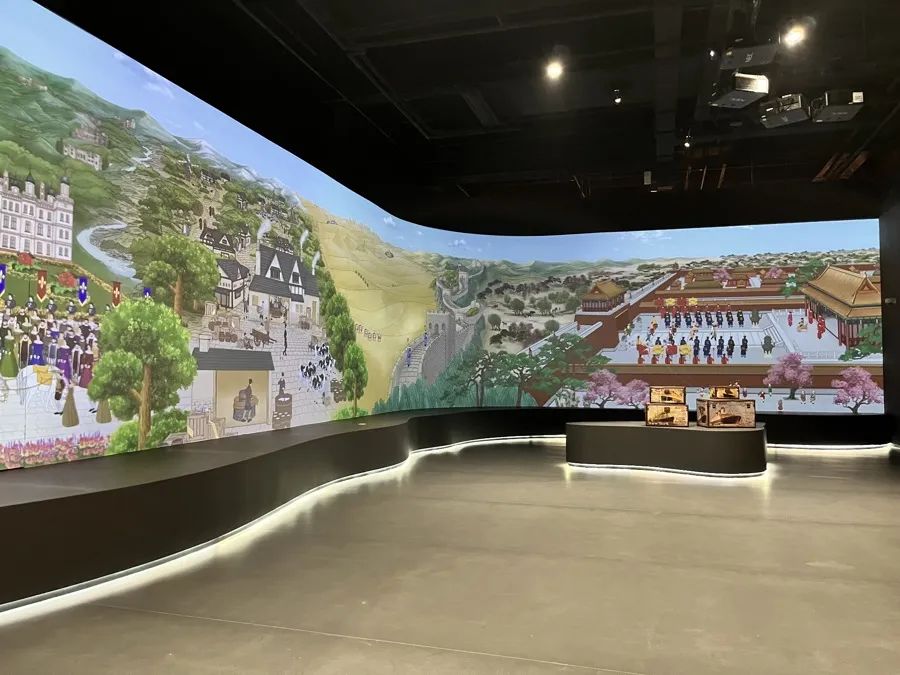 进入第二展厅,眼前是一面超长屏幕。屏幕上一端是古代的欧洲广场,另一端是中国古代宫廷,工作人员表示,观众可通过播放的影片了解巧克力的起源、传播和发展,学习一部“巧克力编年史”。