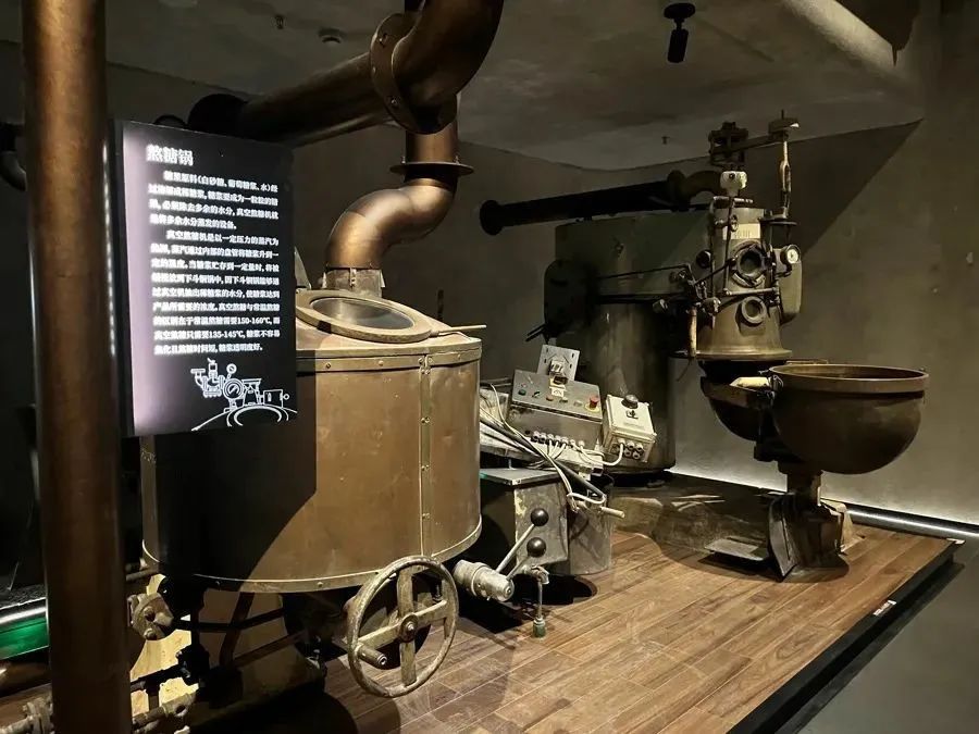 从炒豆机、石磨机、搅拌缸、五辊机到真空干燥箱、熬糖锅、抛光锅、巧克力涂层机、棒棒糖成型机、糖果切割机,人们可以见到各种生产流程所需的机器“真身”,通过阅读说明牌了解该道工序的意义和机器运作的原理。