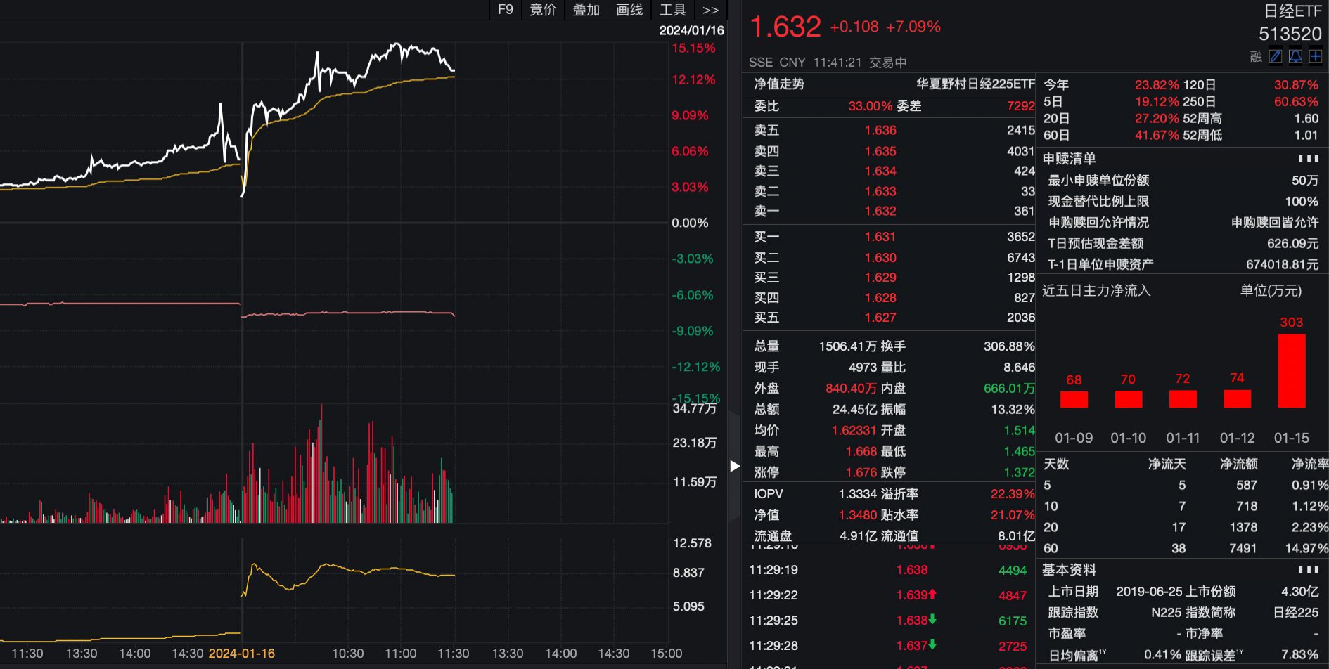 1月16日,华夏野村日经225ETF(513520)再度大涨,盘中涨幅一度近9%,最高报1.668元,再度刷新历史新高,溢价率已超22%。