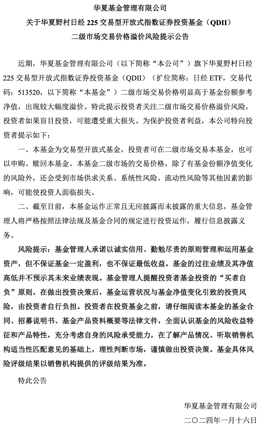 同日,华夏基金管理有限公司(下称“华夏基金”)月内发布第四次关于华夏野村日经225ETF(QDII)二级市场交易价格溢价风险提示公告。