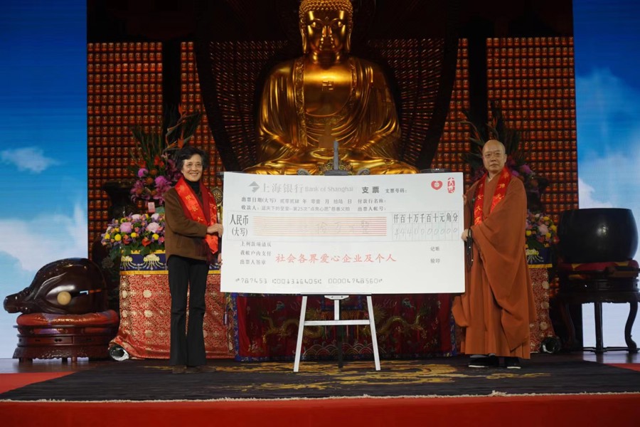 活动现场,上海龙华古寺方丈、上海大慈公益基金会理事长照诚大和尚与上海国际商品拍卖有限公司拍卖师杨宏先生一起执场义拍。