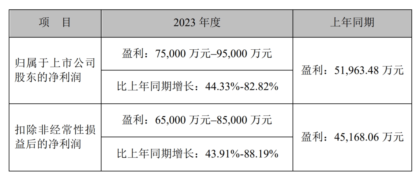 1月23日,华兰生物疫苗股份有限公司(华兰疫苗,301207)发布2023年业绩预告,预计2023年净利润7.5亿元至9.5亿元,同比增长44.33%至82.82%;扣非净利润6.5亿元至8.5亿元,同比增长43.91%至88.19%。