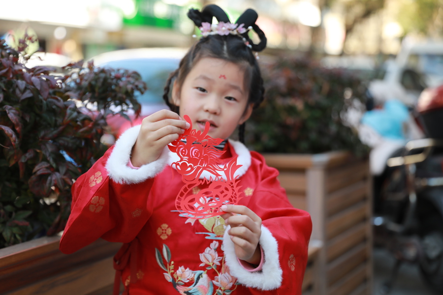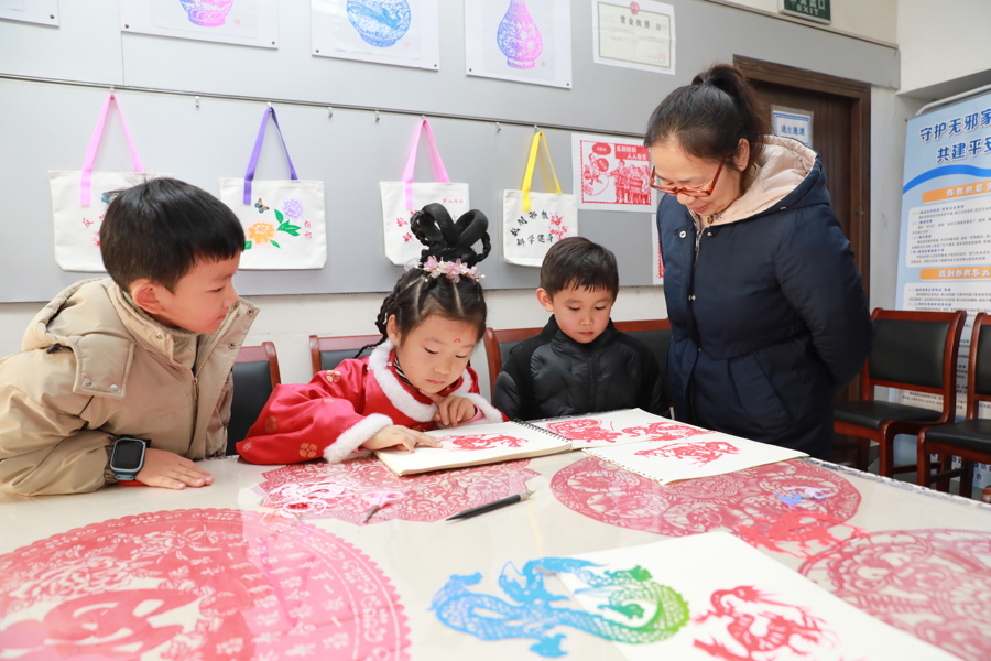值得一提的是,作为金山区级配送文艺指导员的杨红兵,不仅自己热衷剪纸,还在镇文体中心和居委会的支持下,开设了自己的工作室,常年举办剪纸培训班,免费向居民传授剪纸技艺。2023年,她还新收了4名来自湖北、陕西等地的“80后”徒弟,这几天他们趁着寒假带着孩子一起来观摩、学习龙年剪纸,接受文化熏陶,让剪纸非遗文化代代相传,共同祝愿祖国繁荣昌盛、国泰民安。