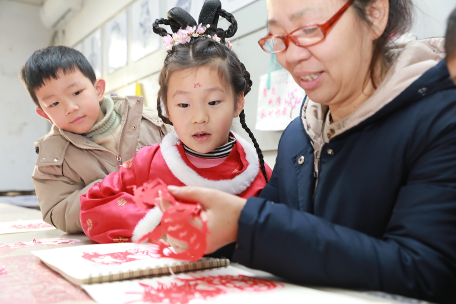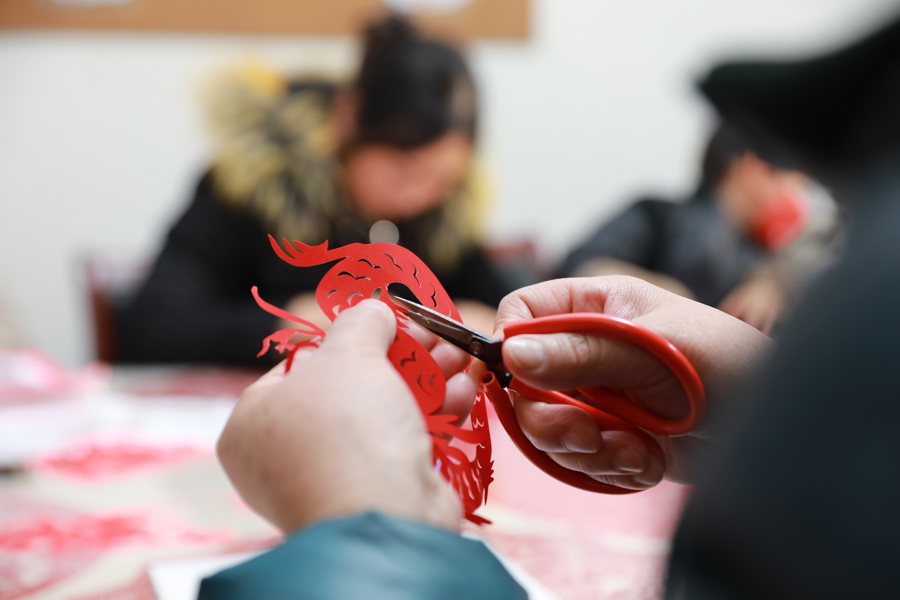 沪郊山阳镇,剪纸达人和学生们共同创作“百龙图”迎新春
