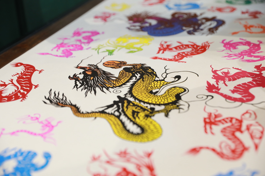 没有好看的图案怎么办?她让学美术的女儿帮忙画出来,之后她按照剪纸特点反复修改。为使整幅作品看起来更加生动有趣,她将大龙剪纸设计成套色剪纸,小龙剪纸设计成单色剪纸。“相较于单色剪纸,套色剪纸(不同颜色的剪纸组合而成)创作难度更高些,有的需要刻很多次才能完成。”杨红兵说。