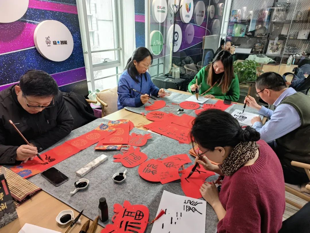 临近春节,现场,来自吴泾社区的两位书法达人也为大家写对联、写福字……把满满的祝福化为笔墨。喜庆吉祥的迎新传统节目,映射出的是中华民族永恒不变的对新年期盼的文化传承。家长们跟着老师们学习书法,也是学得“不亦乐乎”。