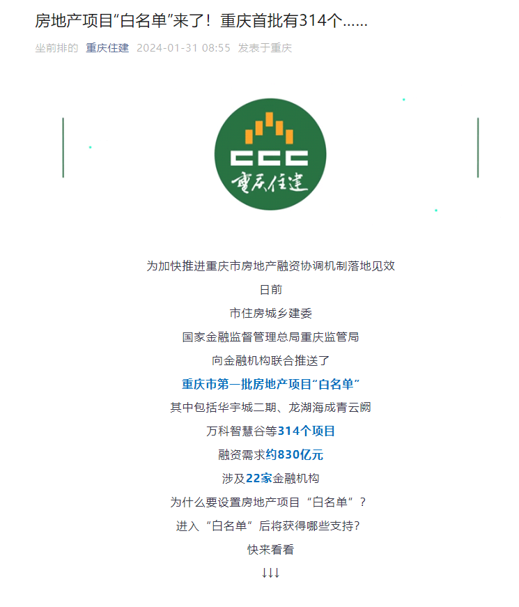 中国质量新闻网讯(顾爱龙)1月31日,官方微信公众号重庆住建消息,重庆市已筛选出首批314个房地产项目,形成“白名单”,并已将名单送达至28家主要银行,包括大型银行、股份制银行、异地城商行及三家市属法人银行。