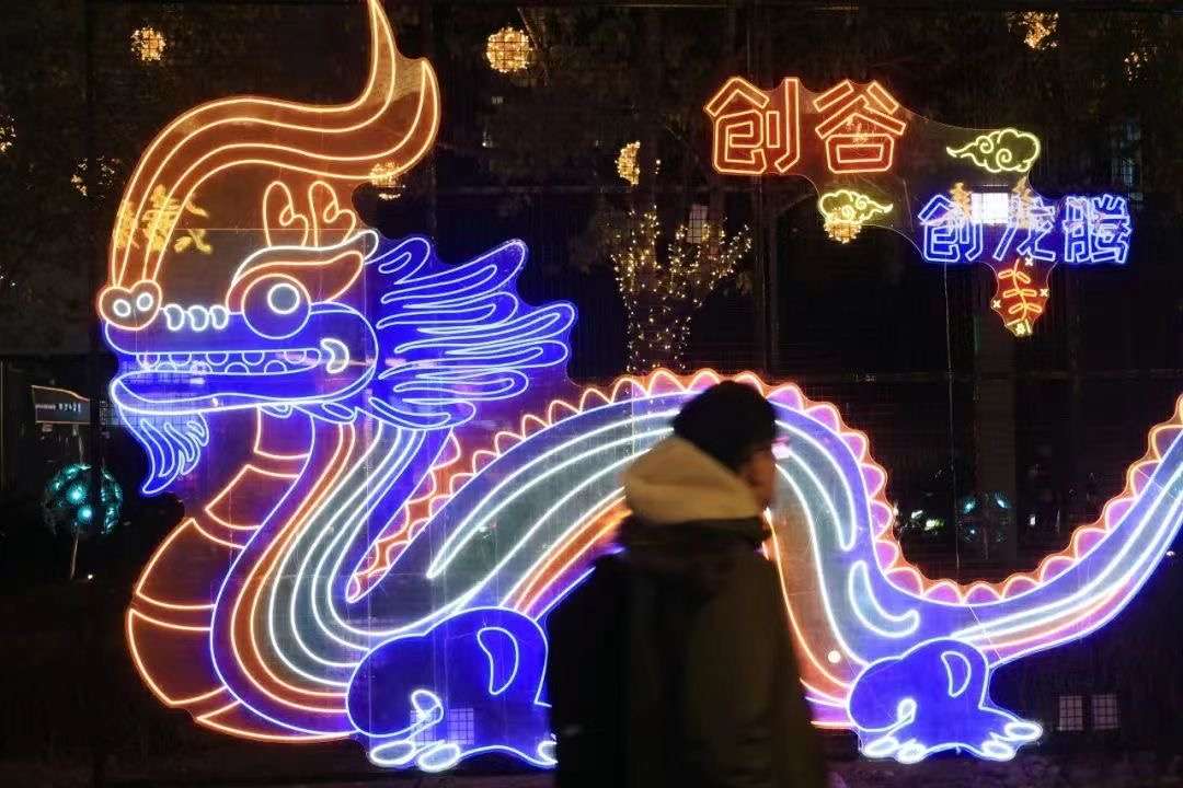 各种龙年花灯在园区的小广场花坛南一楼阶梯等地璀璨闪耀……光与影互相交织时而变幻色彩时而星光闪耀。楼上办公,楼下赏灯,这是长阳创谷独有的浪漫,斑斓缤纷的花灯活泼的多元创意文化古典与时尚在此相伴而生。长阳创谷副总经理蒋雯介绍,在筹划今年灯光秀时,广场增加大型龙灯,大家头脑风暴过“传统中国龙”“现代抽象龙”等,最后结合多种元素呈现出“萌龙”。“我们的初衷是营造春节氛围,也给大家打打气,有长阳长相伴,创谷创龙腾的寓意。”