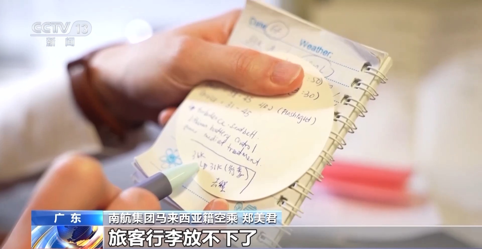 南航集团马来西亚籍空乘 郑美君:有一位旅客坐在36排K,行李后面放不下了,我就给他移到前面,我又担心自己会忘记,所以我一放下就直接把它记下来。