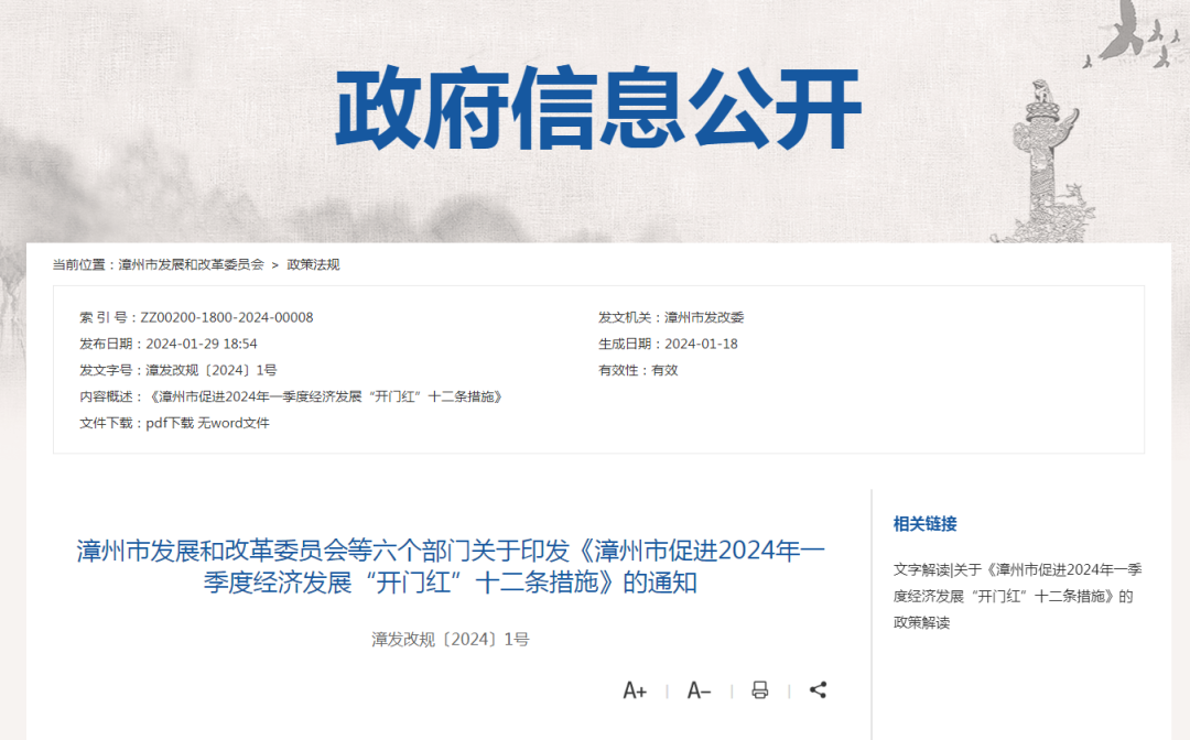 1月29日,福建省漳州市发展和改革委员会等六个部门印发《漳州市促进2024年一季度经济发展“开门红”十二条措施》,推动全市一季度经济发展高于全年预期目标,实现“开门红”。