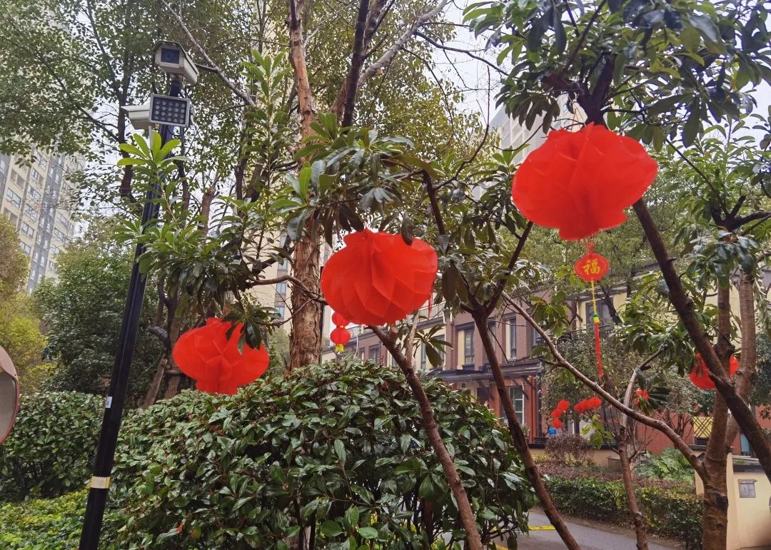 树上、门上挂起了红灯笼
