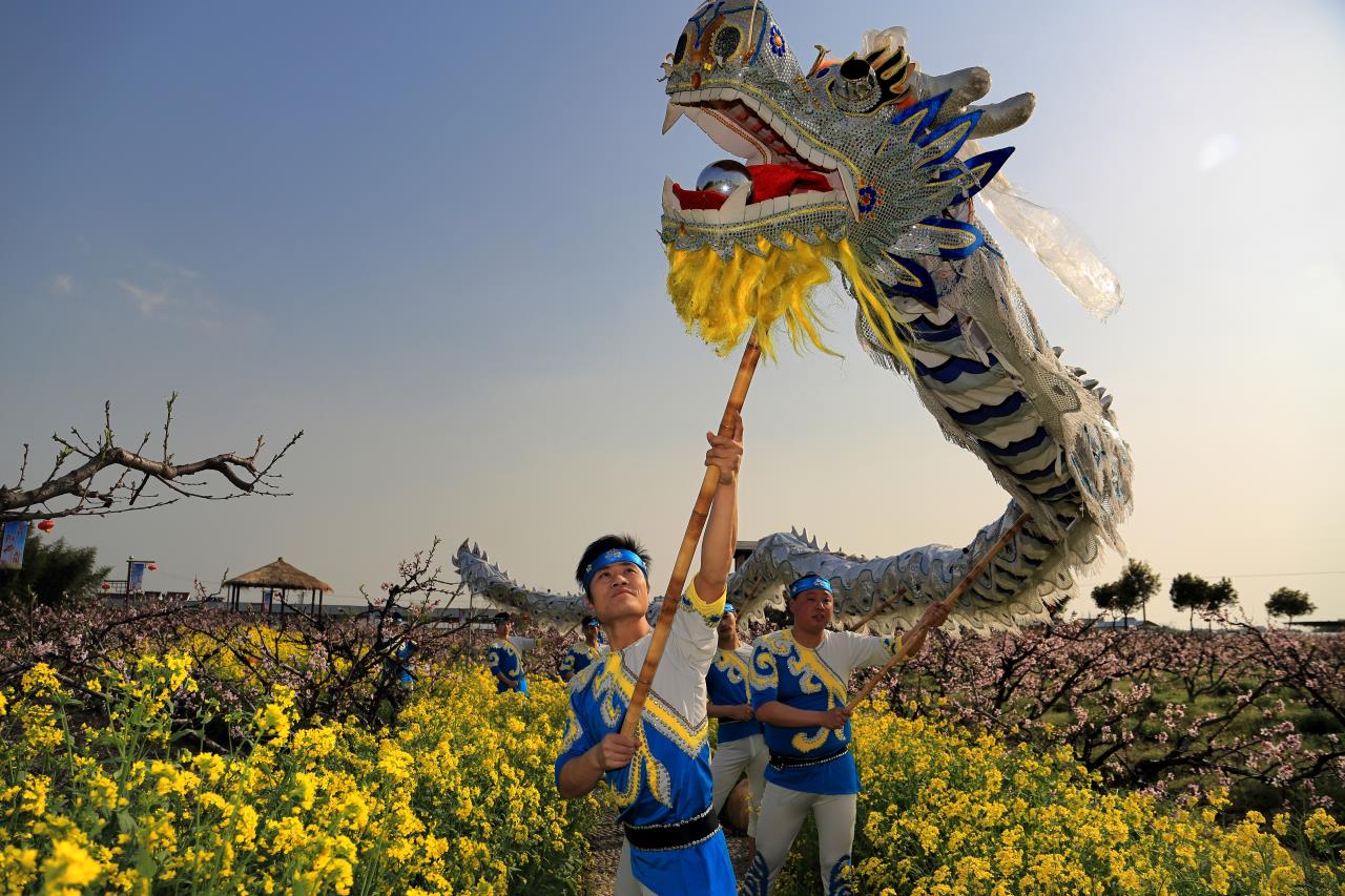 金山有可放的“龙”,即翩翩起舞,收放自如的金山龙类风筝;金山有可赛的“龙”,即已连续举办十二届,于山阳龙泉港举办的龙舟赛;金山有可吃的“龙”,即香糯爽口、甜而不腻的白龙糕;金山还有可闻的“龙”,即位于朱泾花开海上生态园中似烟如雪,暗香浮动的“龙游梅”……