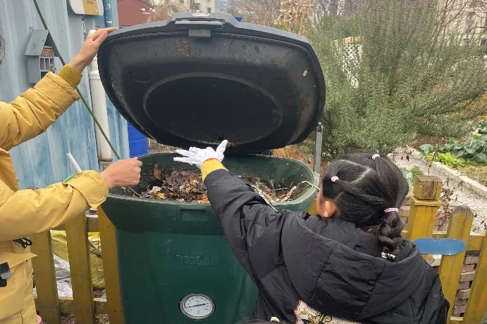 活动的另一项重要内容是利用落叶和枯枝制作堆肥。在确保不破坏植物的前提下,小朋友们欢快地在农场中收集落叶和枯枝。大家分工合作,小龄组的小朋友负责将落叶撕成小块,而大龄组的小朋友则用专门的剪刀将枯枝剪小。在大家的共同努力下,堆肥桶被装得满满的,落叶和枯枝也变成了滋养土地的宝贵肥料。